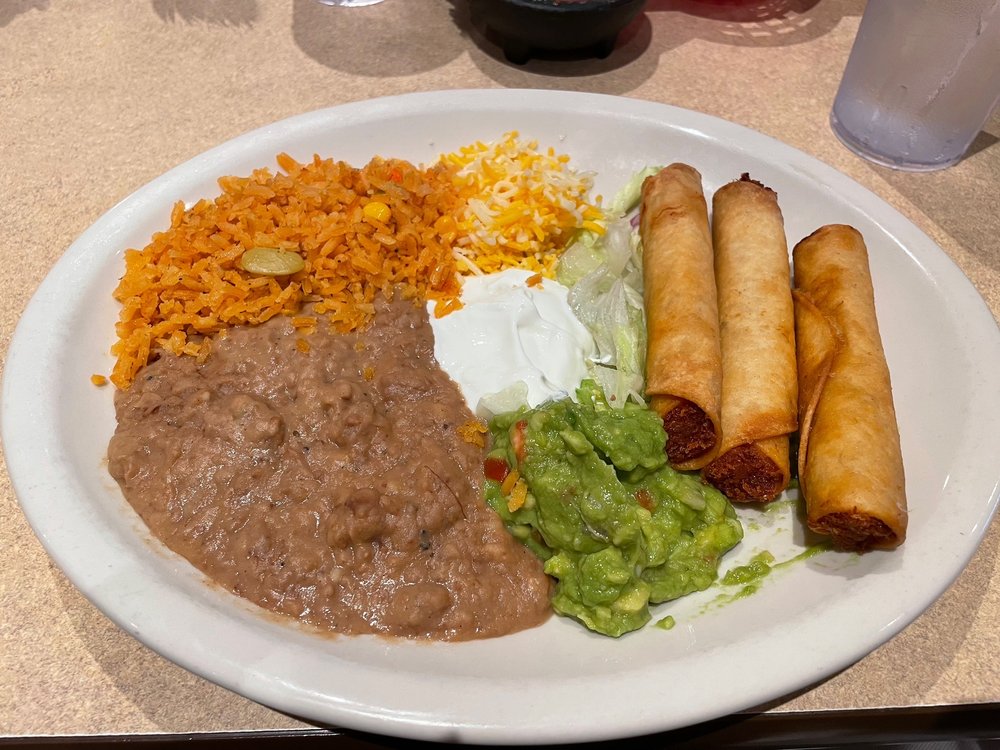 Three fried corn tortillas rolled, stuffed with chicken cheese, served with guacamole, sour cream cheese, rice & refried beans.