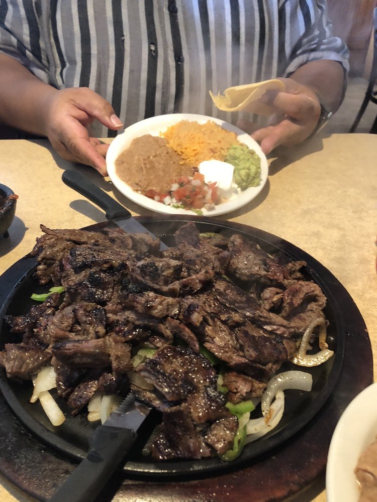 Chicken or beef grilled with onions & bell pepper on a hot skillet, served with guacamole, sour cream pico de gallo, rice & refried beans.