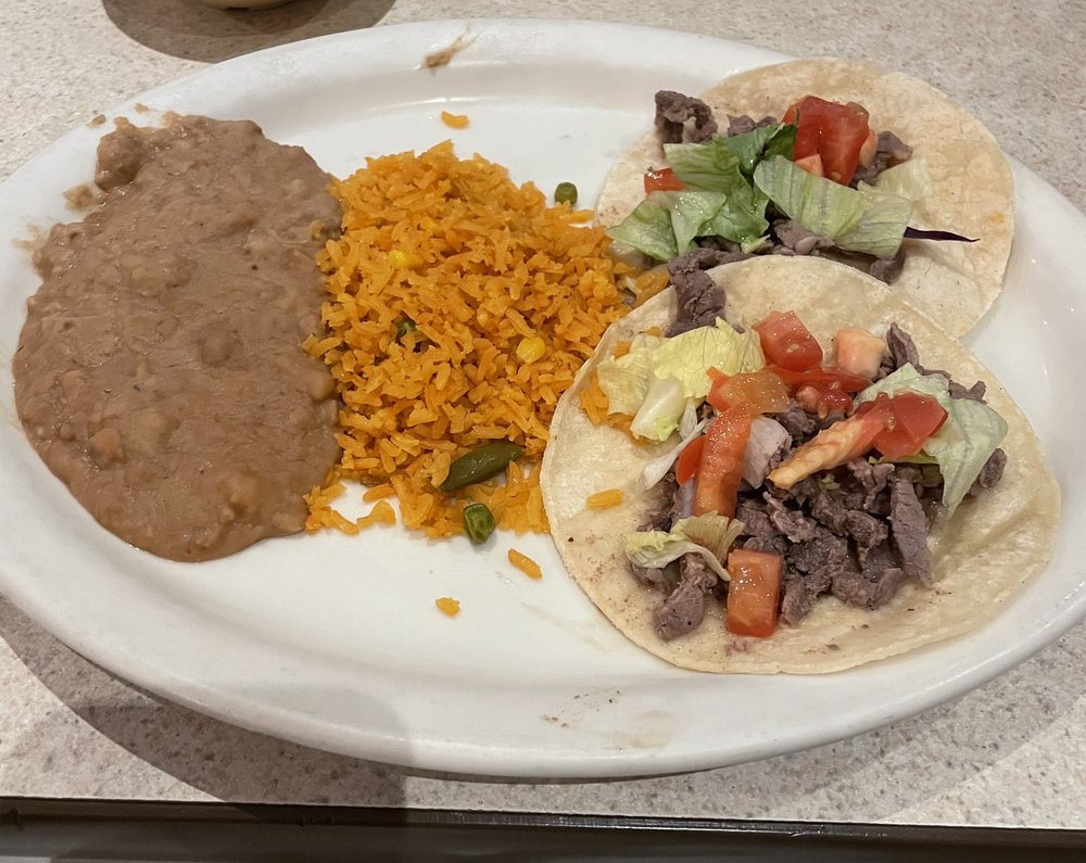 Three beef brisket tacos, wrapped in a soft flour tortilla pico de gallo, rice & retried beans.