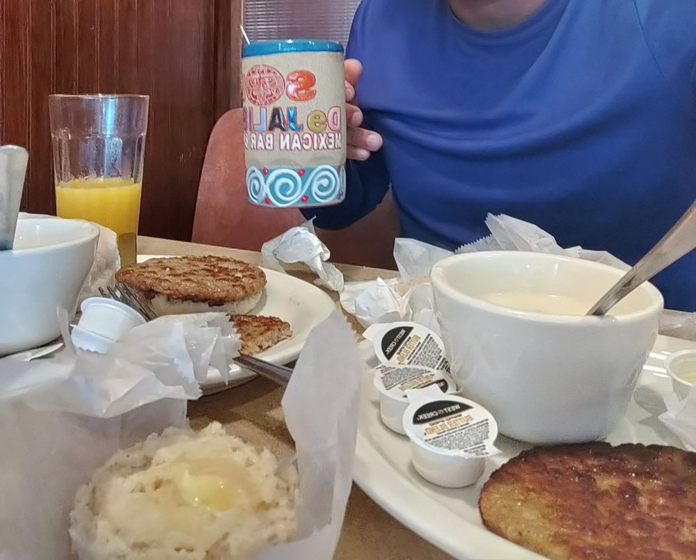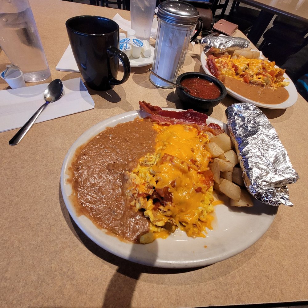 Three scrambled eggs mixed with crispy con tortilla chips topped with ranchero sauce and melted cheese, served with bacon, refried beans and potatoes.